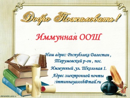 Место нахождения: 368875 , Республика Дагестан Тарумовский район, х. Имунный, улица Школьная,здание №1. тел.: 89285486706С уважением, директор школы Янмурзаева Гульфира Хамаровна и администрация сайта.